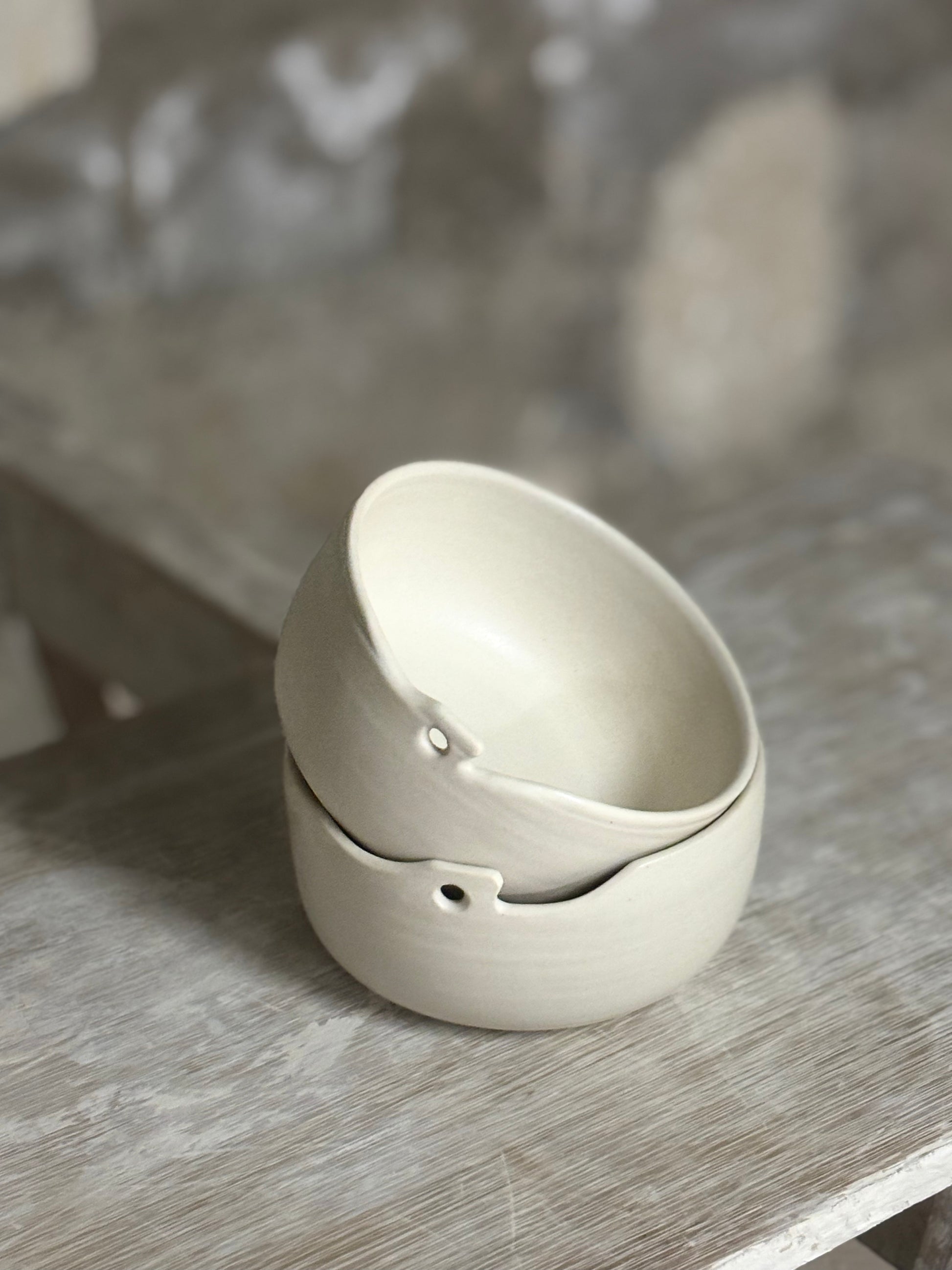Réalisée en grès blanc lisse, ces bols sont recouverte d’un émail mat légèrement satiné qui capte et porte la lumière avec délicatesse. leur format généreux d'à peu près 12,5 cm de diamètre pour 6 cm de hauteur offre une belle profondeur, parfaite pour accueillir vos créations culinaires avec raffinement ou même vos céréales au petit déjeuner .